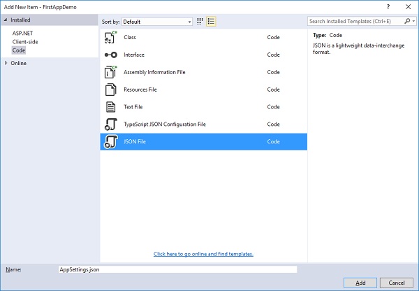 فایل را با نام AppSettings.json ذخیره کنید و سپس روی دکمه Add کلیک کنید تا فایل به پروژه اضافه شود.