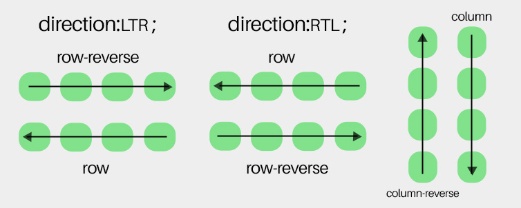 نکته: حتما توجه داشته باشید که مقدار flex-start و flex-end چیدمان را از ابتدا و انتها المان شروع می کند. اگر چیدمان المان راست به چپ باشد (direction: rtl;) ابتدای المان سمت راست و انتهای آن سمت چپ می شود. اگر چیدمان المان چپ به راست باشد (direction: ltr;) ابتدای المان سمت چپ و انتهای آن سمت راست می شود. برای درک بهتر، نمونه کد زیر را مشاهده کنید.
