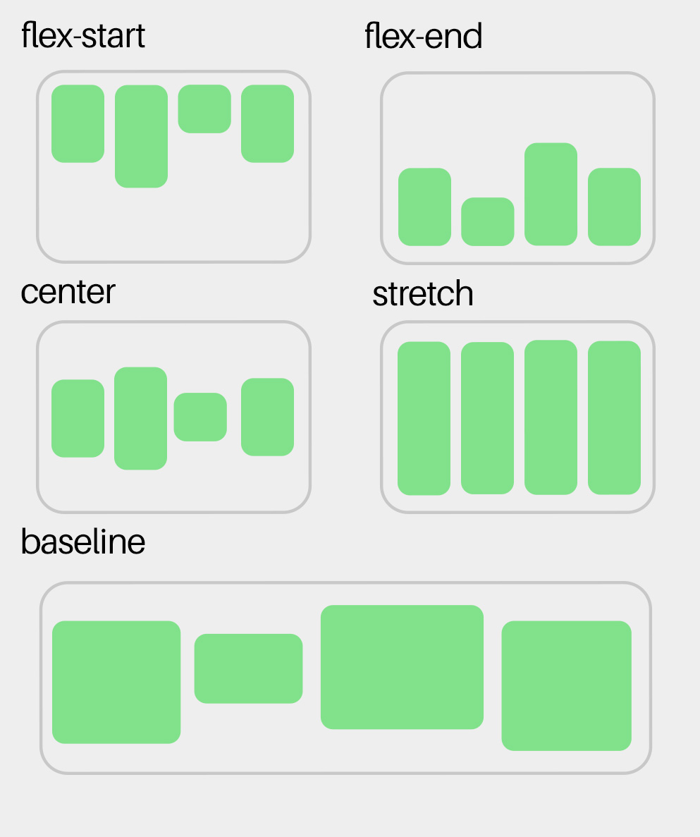 - baseline: آیتم ها به گونه ای قرار داده می شوند که خطوط پایه آنها، هم خط شوند.