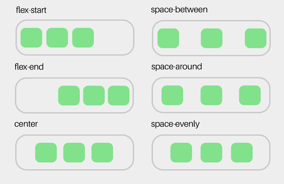 - space-evenly: فضای بین هر آیتم منعطف برابر است. فضای آیتم اول به ابتدا و آیتم آخر به انتها، نیز برابر فضای بین آیتم ها است.