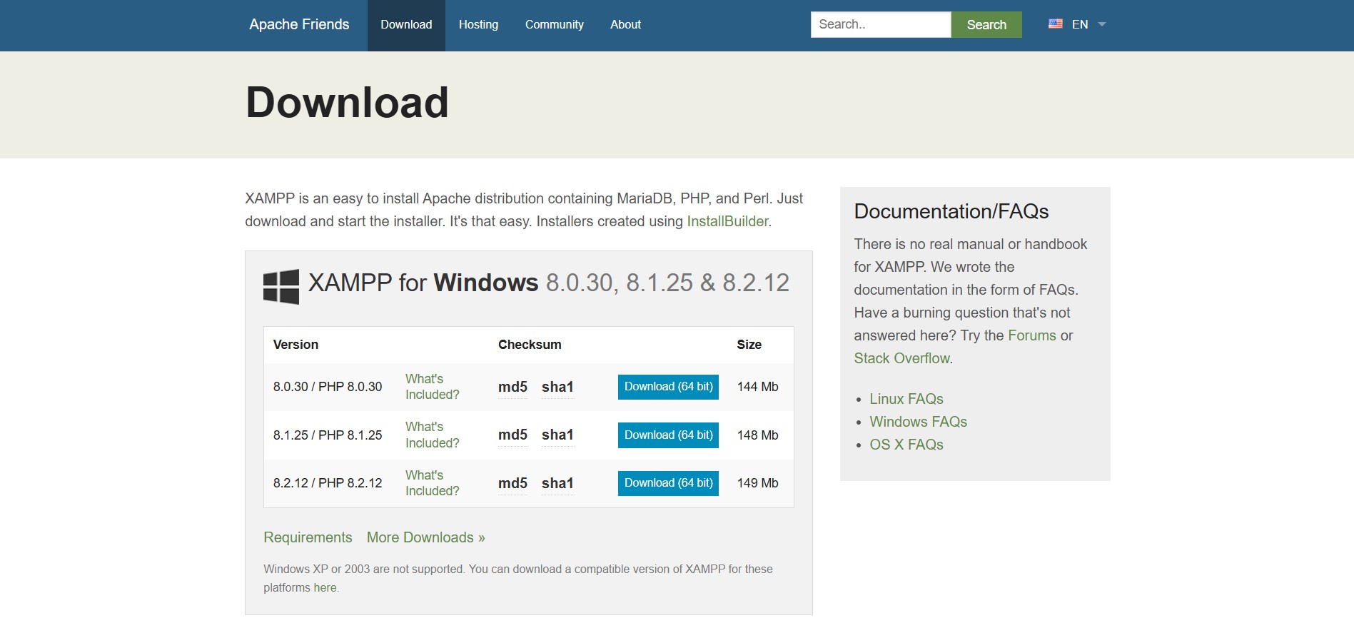 برای دانلود برنامه xampp به وبسایت رسمی apachefriends.org و بخش download مراجعه کنید و براساس اطلاعات سیستم خود، برنامه را دانلود کنید.