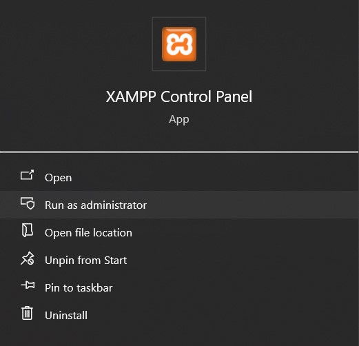 بعد از نصب برنامه xampp در ویندوز، از طریق گزینه run as administrator برنامه را اجرا کنید.