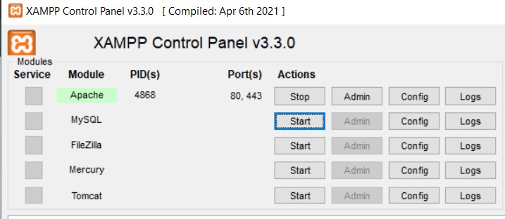 در محیط برنامه گزینه های مختلفی را برای اجرا مشاهده می کنیم که برای اجرای MySQL از گزینه start آن استفاده می کنیم.