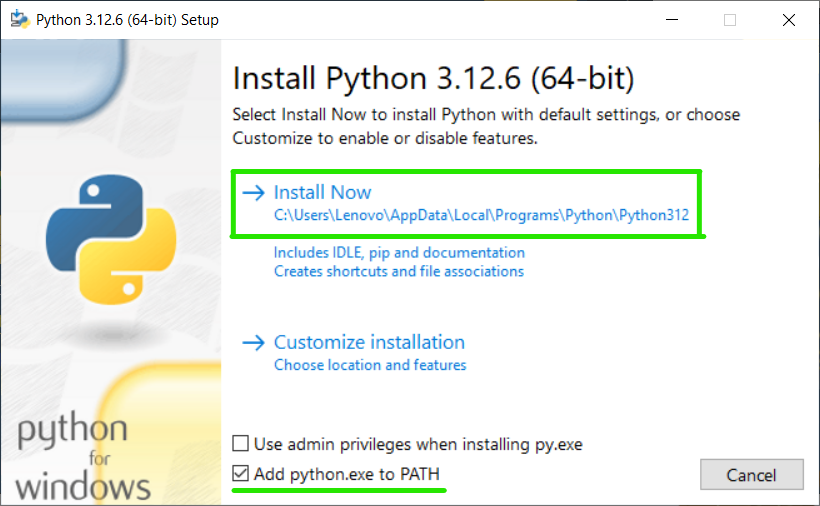 با دانلود فایل آن را باز کنید. در صفحه نصب، گزینه Add python.exe to PATH را برای اجرای بهتر برنامه در command line بزنید و گزینه install now را برای شروع نصب بزنید.